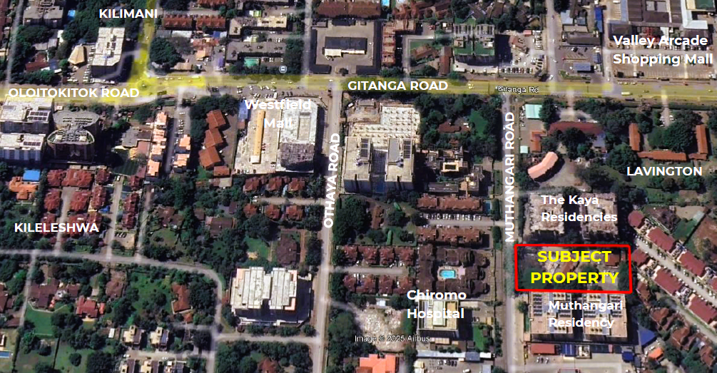 Approximately 0.95 acre site situated along Muthangari Road in Lavington, about 150 metres from Gitanga Road and 250 metres from Valley Arcade Mall. This prime site offers exceptional potential for high-density residential, serviced apartment, or office development (subject to approvals).